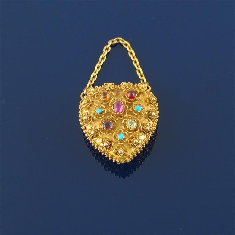 A Regency gold heart form locket pendant, cannetille decoration to both sides, the cover set with gem stones opening to reveal glazed locket compartment containing plaited hair. With fine link chain. 2.5cm high.