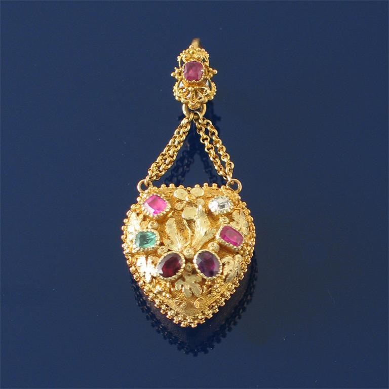 A Regency two colour gold heart form locket pendant, the front chased with foliate fruit and vine decoration and set with Ruby, Emerald, Garnet, Amethyst, Ruby and a Diamond (REGARD). The reverse chased with a forget-me-not set with an emerald and ruby to a matted ground. Opening to reveal plaited hair to the glazed locket compartment. Engraved with memorial inscription 'Sarah Armstrong OBT 26 Janry 1828 At 18', suspended with chains from a ruby set cannetille pendant loop. The heart 2.3cm high.