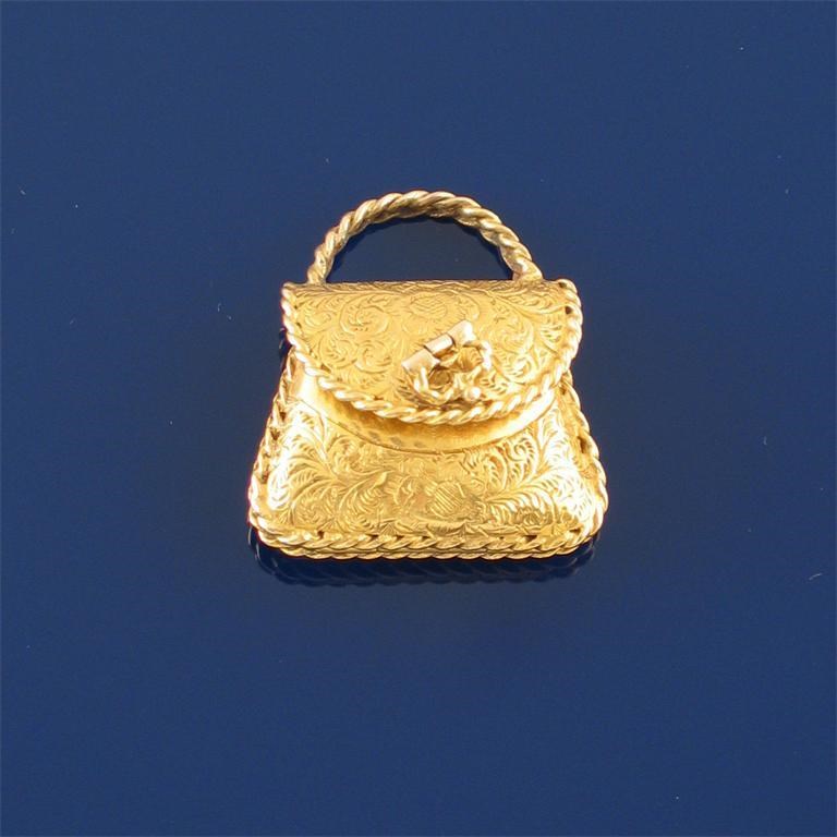 A Regency gold bag form locket, chased overall with foliate decoration. Double hinged and opening to reveal a glazed locket compartment. 2.5cm high.
