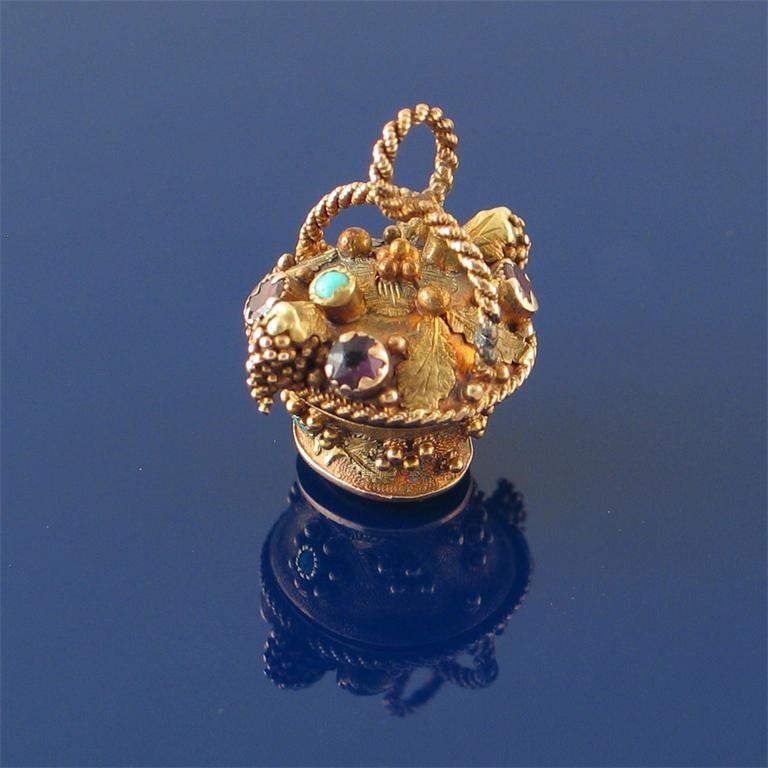 A Regency two colour gold basket form locket seal, with amethyst and turquoise fruits and gold grapes. Opening to reveal a glazed locket compartment containing hair. The base mounted with an oval shaped amethyst. 2.2cm high.