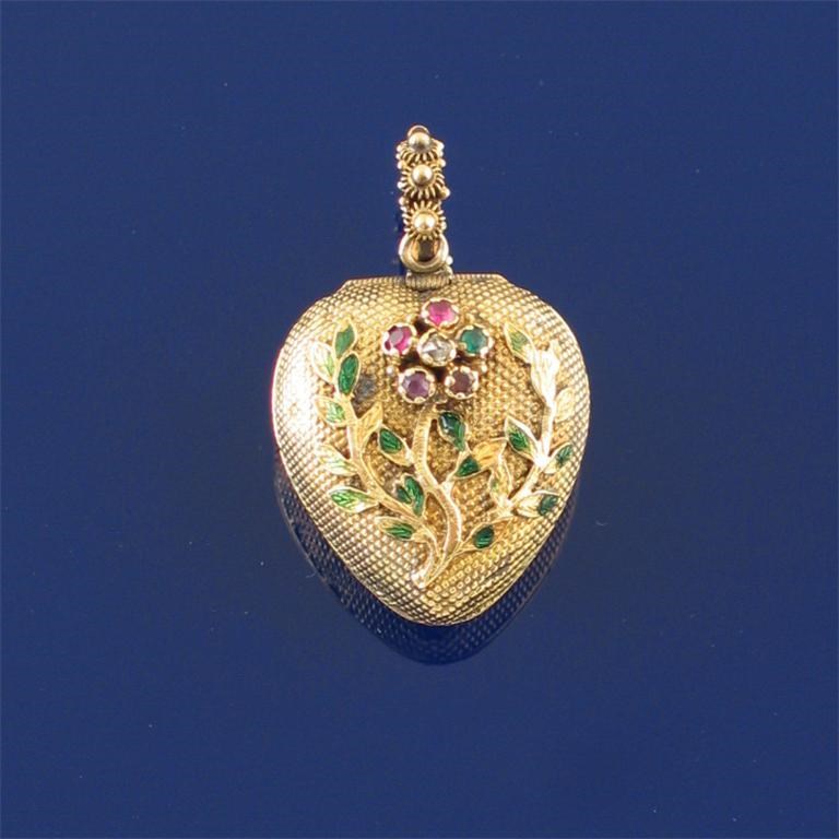 A Regency gold heart form locket, the front applied with a flower with green enamel leaves (some imperfect) and set with Ruby, Emerald, Garnet, Amethyst, Ruby and Diamond (REGARD), suspended from a cannetille loop. The heart 2cm high.