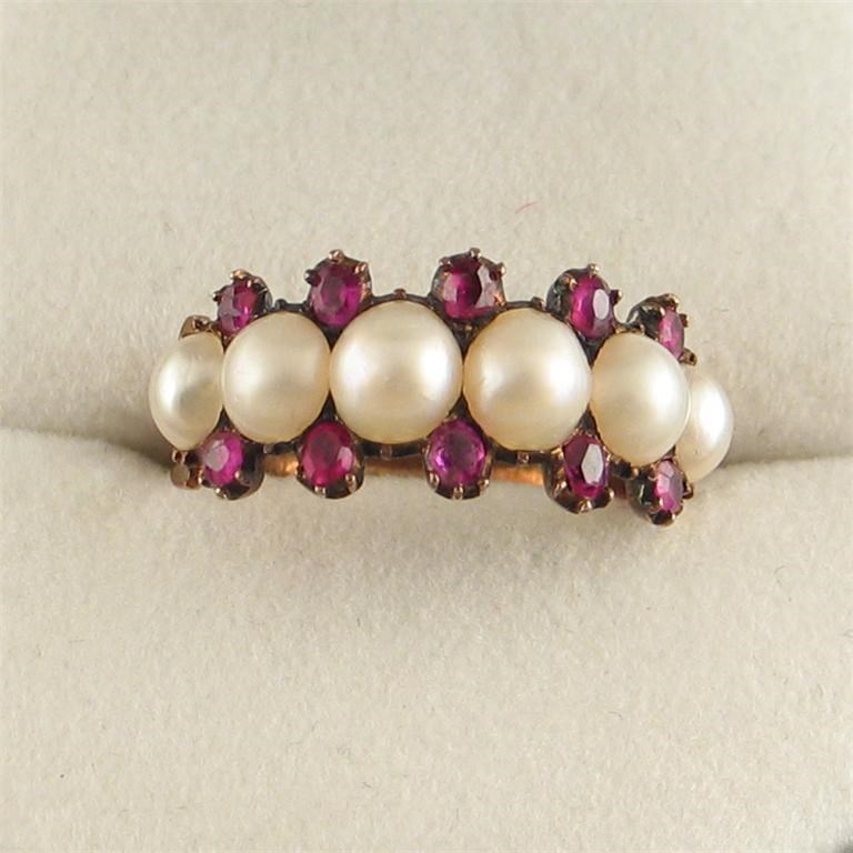 A late George III pearl and ruby half hoop ring, set with a line of six half pearls and a border of oval shaped rubies in gold. Size Q