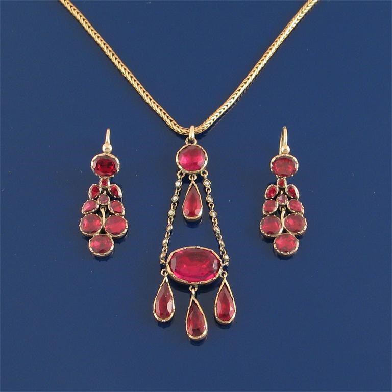 A George III pendant, set with red stones and seed pearls in gold. A pair of flat garnet set gold drop earrings and a gold fine link necklace.
