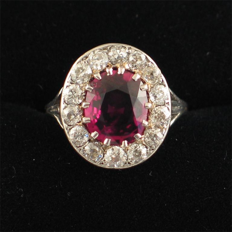 A ruby and diamond cluster ring, the oval shaped ruby is set within a surround of circular cut diamonds in white gold and platinum.
