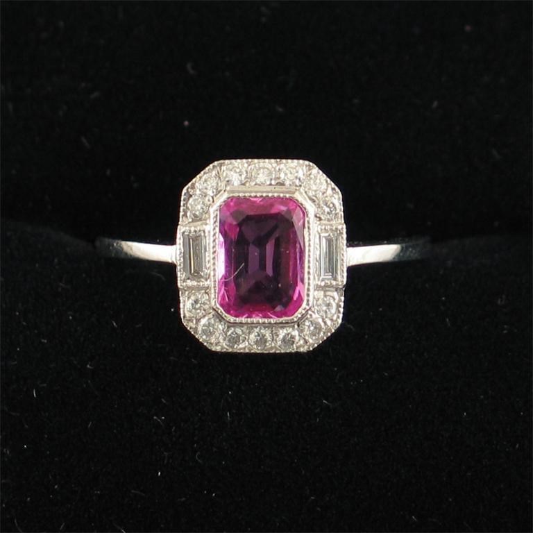 A pink sapphire and diamond cluster ring, the emerald cut pink sapphire is set within a surround of diamonds in 18ct white gold.