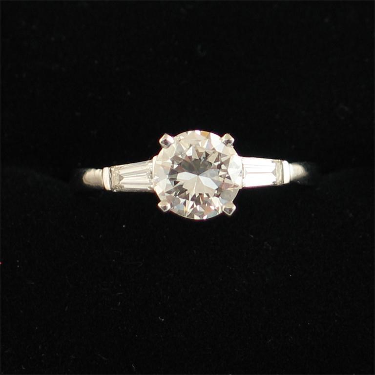 A diamond solitaire ring, the brilliant cut diamond is set with two tapered baguette shoulder diamonds in platinum with gemmological report No. 982415 stating that the diamond weighs 1.20 carats, has F colour with SI 2 clarity.