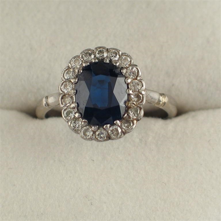 A sapphire and diamond cluster ring, the oval shaped sapphire is set within a surround of diamonds in platinum. Boxed.
