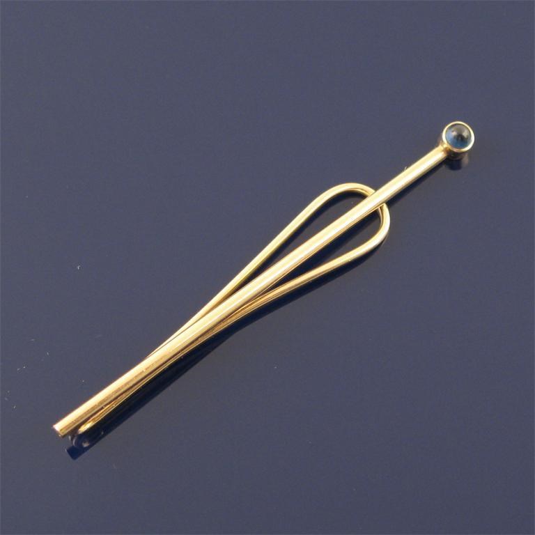 A gold money clip by Cartier, with a cabochon sapphire set to the terminal. 6.5cm wide.