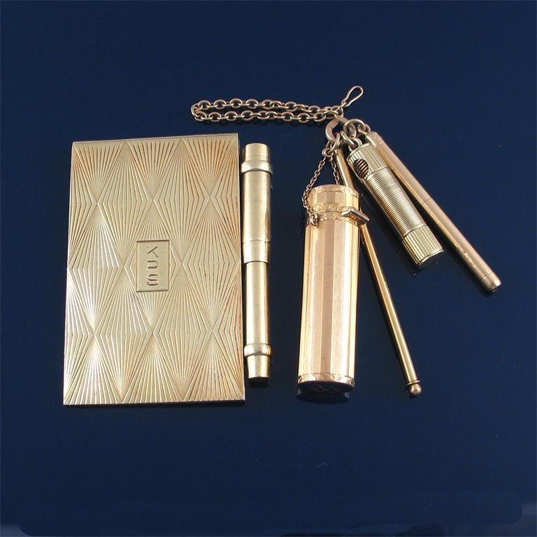 A 14ct gold cheque container by Cartier, containing some cheques from the American Securities and Trust Co., with named account for Katharine P. Spencer. The front engraved with the initial K.P. S. with fitted small gold fountain pen signed Cartier. Together with a gold cylinder container, a gold pill dispenser, a gold swizzle stick by Cartier, and a gold propelling pencil by Cartier.