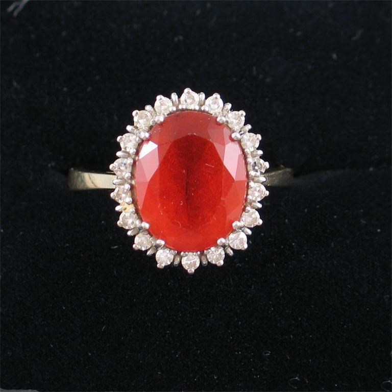 A fire opal and diamond cluster ring, the oval shaped opal is set within a surround of small diamonds in gold.