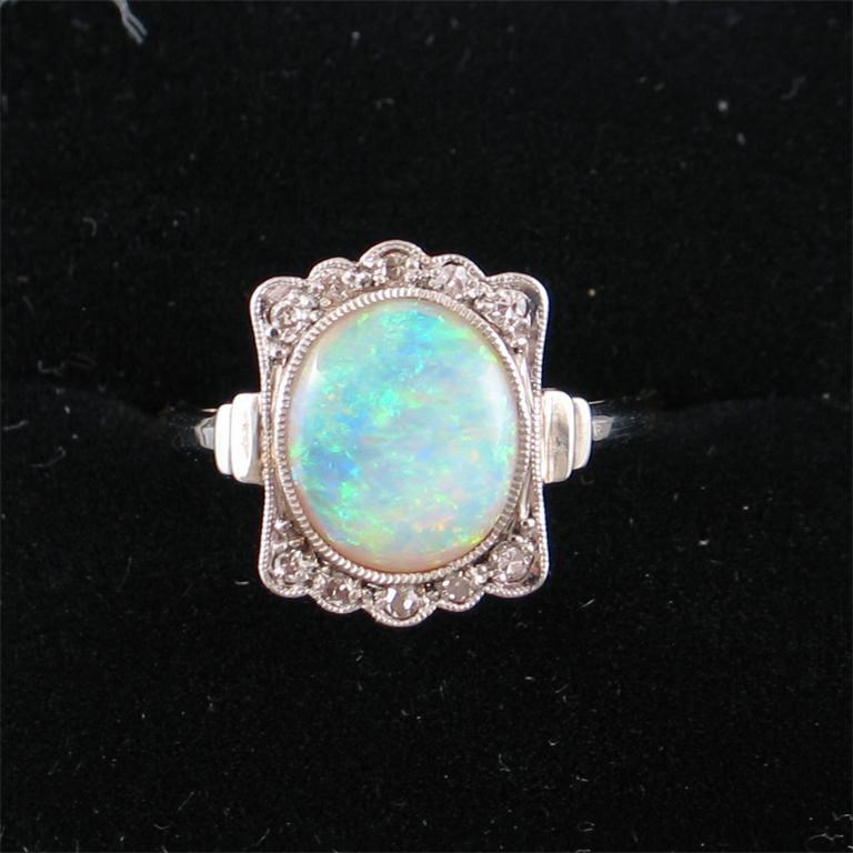 An opal and diamond set cluster ring, the oval shaped opal is set with ten small graduated circular cut diamonds in gold.