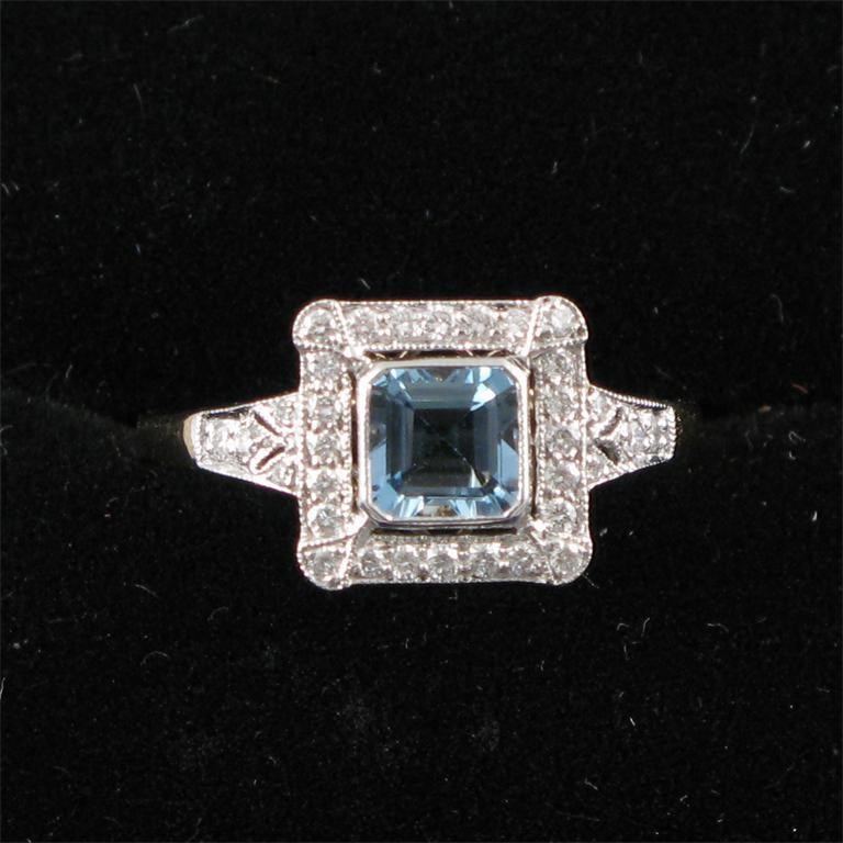 An aquamarine and diamond cluster ring, the square shaped aquamarine set within a surround of diamonds in gold.