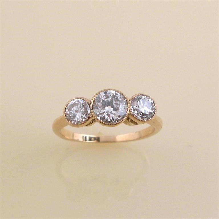 A diamond three stone ring. The three circular cut diamonds are set in gold. Size K 1/2.