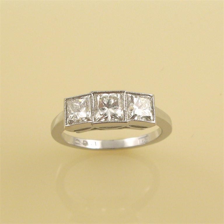 A diamond three stone ring, set with three princess cut diamonds weighing in total approx. 1.60 carats, size M.
