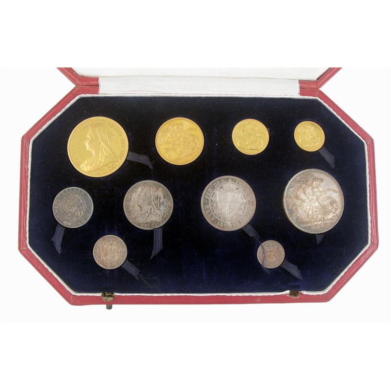Victoria (1837-1901), Proof specimen set of coins, 1893, comprising Gold Five and Two Pounds, Sovereign and Half-Sovereign, Silver Crown to Threepence, in unofficial fitted case.