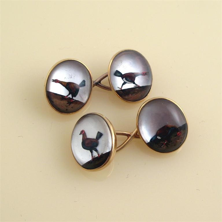 A pair of 19th century carved crystal fighting cock gold cuff links. Each designed as a cockerel in various stages of the fight. Each 1.5cm high.