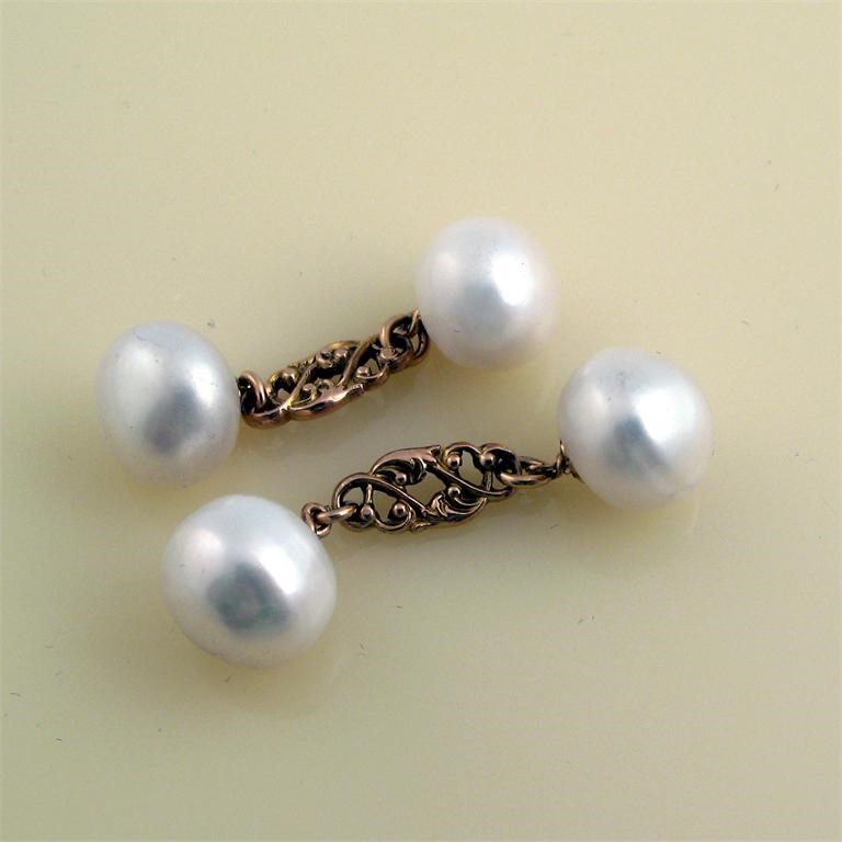 A pair of cultured pearl and gold cuff links.