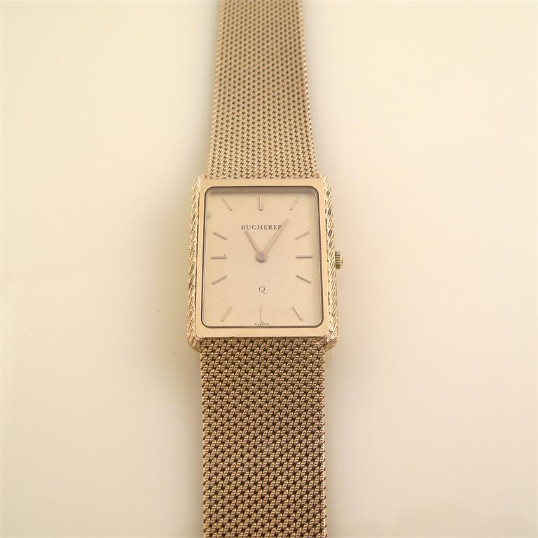 A gentleman's 18ct yellow gold wrist watch by Bucherer. The plain rectangular dial with baton numerals and signed Bucherer, numbered to the reverse 256002. 18ct integrated gold Bucherer band. Cased by Bucherer.