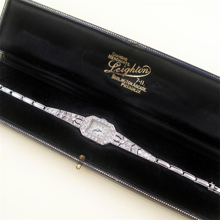A diamond set lady's cocktail watch, the rectangular dial with Arabic numerals, diamond set bezel and shoulders, in platinum to a platinum expanding bracelet, fitted case.