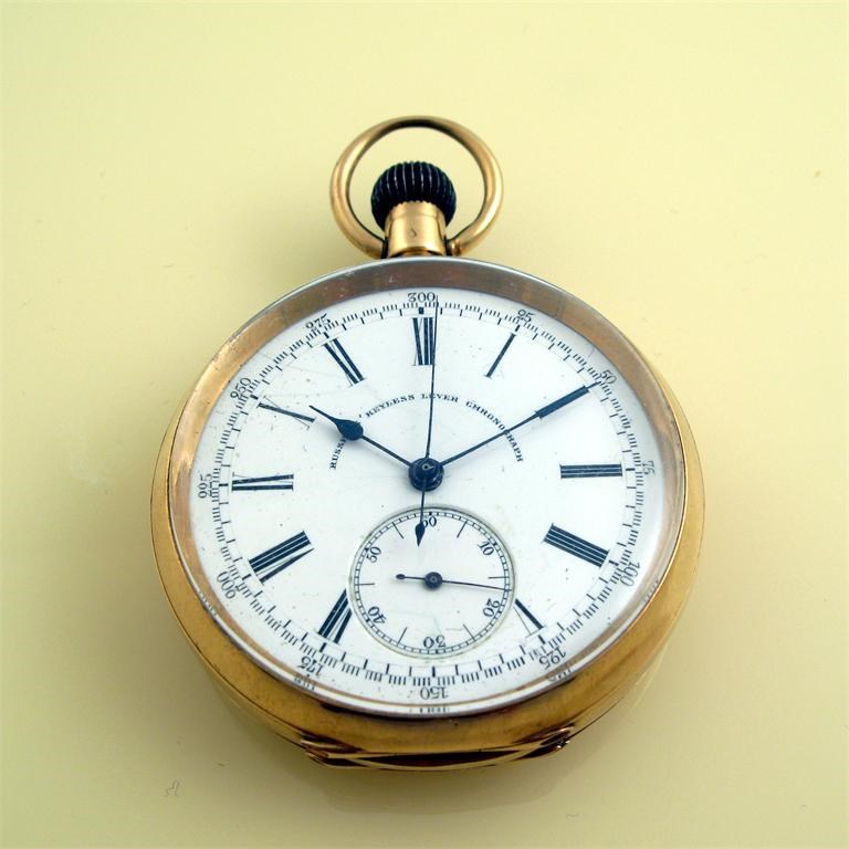 A gold open faced chronograph. White enamel dial signed 'Russells Keyless Lever Chronograph'. Plunge action and with subsidiary seconds dial. Signed movement.