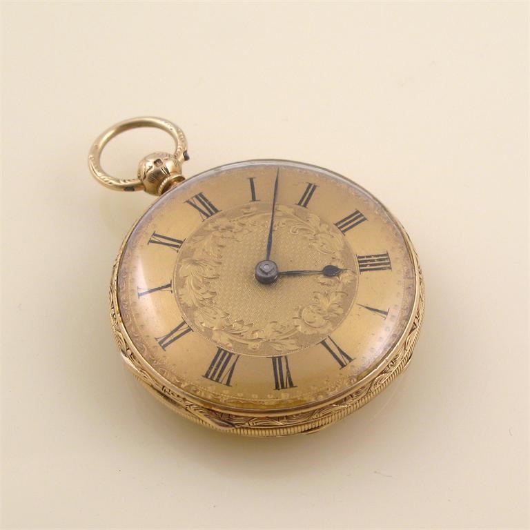A Victorian 18ct gold open face pocket watch, the engraved gilt dial with Roman numerals, the keywind fusee movement signed 'Clark & Son, Greenock,' and numbered 1752, in a foliate engraved case.