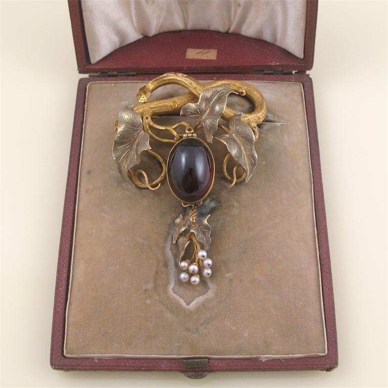 A Victorian gold foliate brooch realistically formed and suspending an oval shaped cabochon garnet and further foliate pendant set with seed pearls. 7.5cm high. Fitted case.