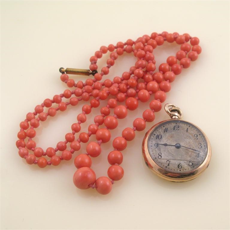 A graduated coral bead necklace, and a gold fob watch. (2)