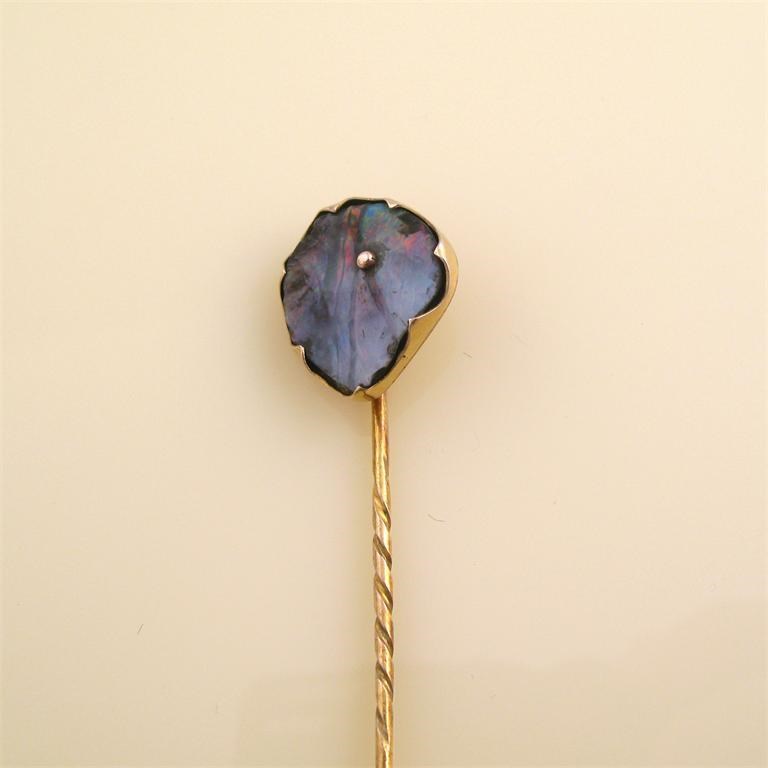 A gold stick pin incorporating a section of boulder opal. Fitted case by Hancock. 1.8cm wide.