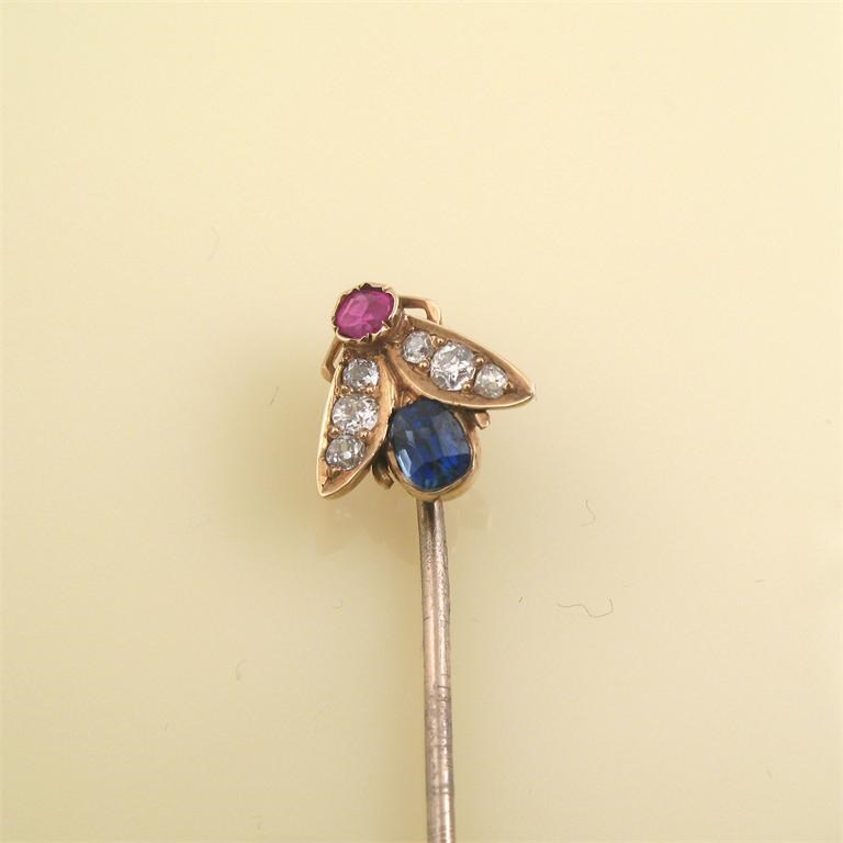 A gem set bee stick pin. Set with a ruby, diamonds and sapphire in gold. Fitted case by Collingwood.