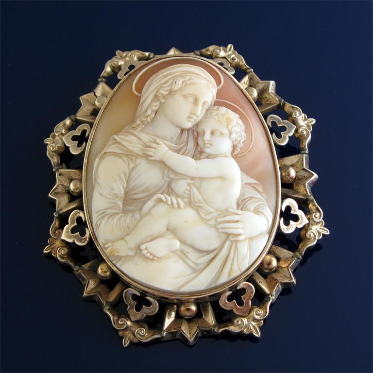 A carved shell cameo brooch, depicting the Madonna and Child. Ornate foliate scroll gold frame. Fitted box. Cameo 5.5cm high.