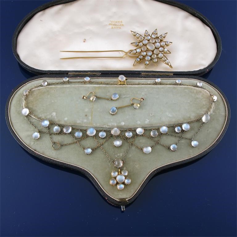 A necklace mounted with moonstone cabochons, fitted case, and a star-form aigrette set with moonstones and earrings.