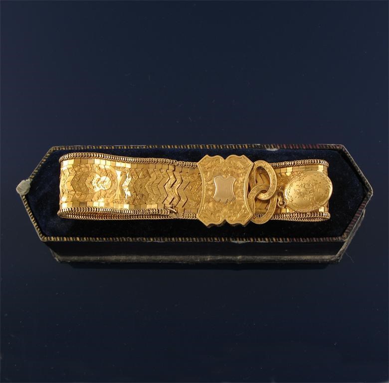 A 19th century French gold strap bracelet with slide. Damaged. Inscription to the reverse dated 1856. Box. 50g.