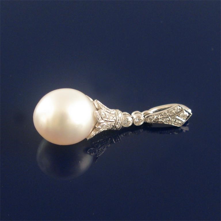 A large cultured pearl and diamond pendant, the pearl measures approximately 12.5mm x 14.5mm. The white gold pendant mille grain set with graduated circular cut diamonds.