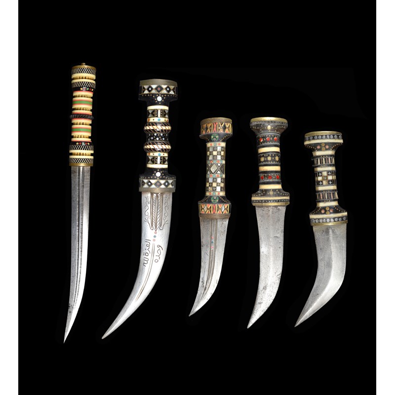 λ Five Syrian daggers (jambiya), each with a stout curved blade, banded and mosaic decorated hilts formed of bone, brass, ebonised wood and other materials; one example having Arabic text etched to the forte and a crescent motifs in green material to the hilt; another with unusually slender blade and bands of miniature balusters to the hilt. [5]