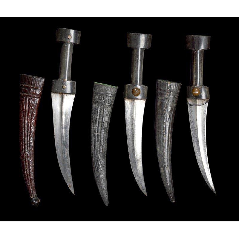 Three Albanian daggers (jambiya), curved and tapering blades with fine medial ridges, hilts of polished horn set with copper studs, moulded leather scabbards. [3]