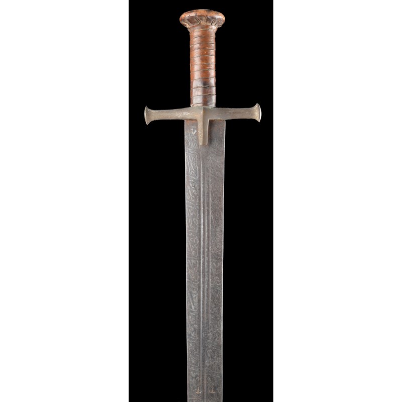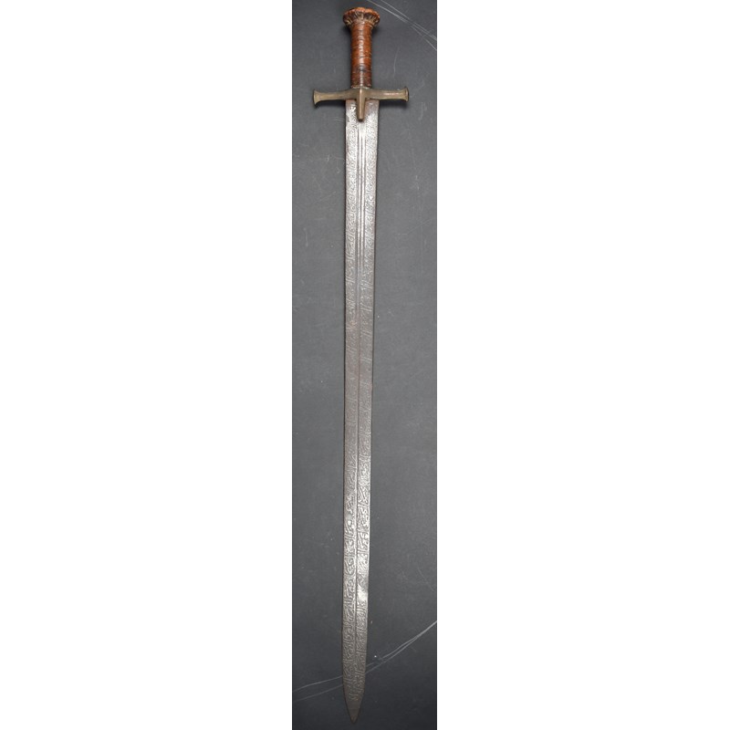 A Sudanese sword (kaskara), broad double edged blade 38 in., narrow fullers, etched over its entire surface with Arabic text; brass cross piece, leather bound grip and pommel.
