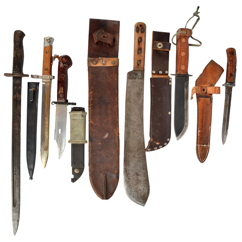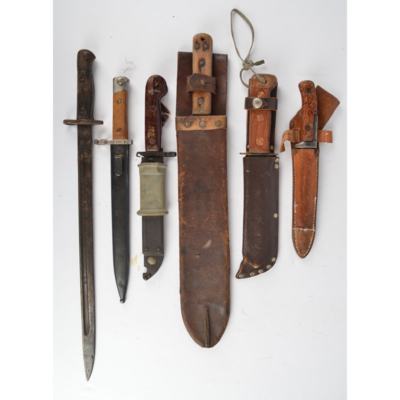 A collection of edged weapons, comprising: an AKM type 1 bayonet, an Austrian M1895 Mannlicher bayonet, a Czech VZ-58 bayonet with composition grip, a British 1943 dated machete, an MOD knife, and a British 1907 pattern bayonet; all but the last complete with scabbards. [6]