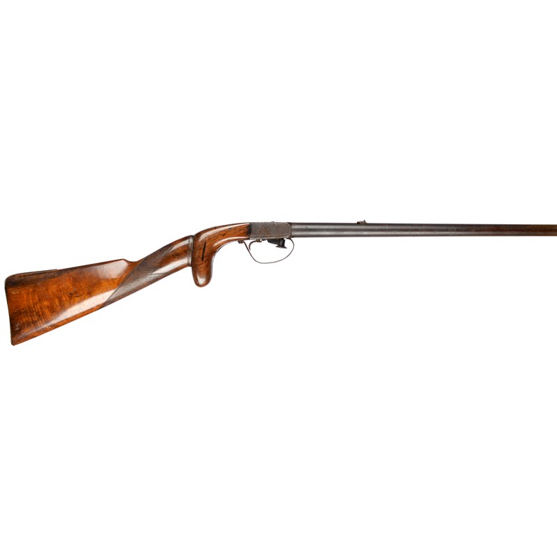 An English 54 calibre underhammer percussion rifle with 'takedown' butt, round barrel 28.5 in. with one standing and one folding leaf sight, seven groove rifling, Birmingham proofed, acanthus engraved action, the hammer drawn down by a knurled button, later trigger guard, wooden pistol grip, detachable butt (also later) with engraved brass plate.