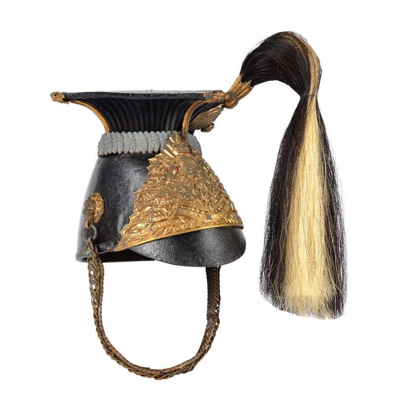 A post 1902 9th Lancers other ranks lance cap, patent leather skull with gilt helmet plate bearing regimental title and battle honours, chain chin strap suspended from gilt lion masks, square crest rising to the flat top with ribbed cloth sides and gilt acanthus corner mounts, blue cloth band, black and white horse hair plum to a gilt socket rising from a bullion cloth roundel; in a 20th Century glazed wooden display case.