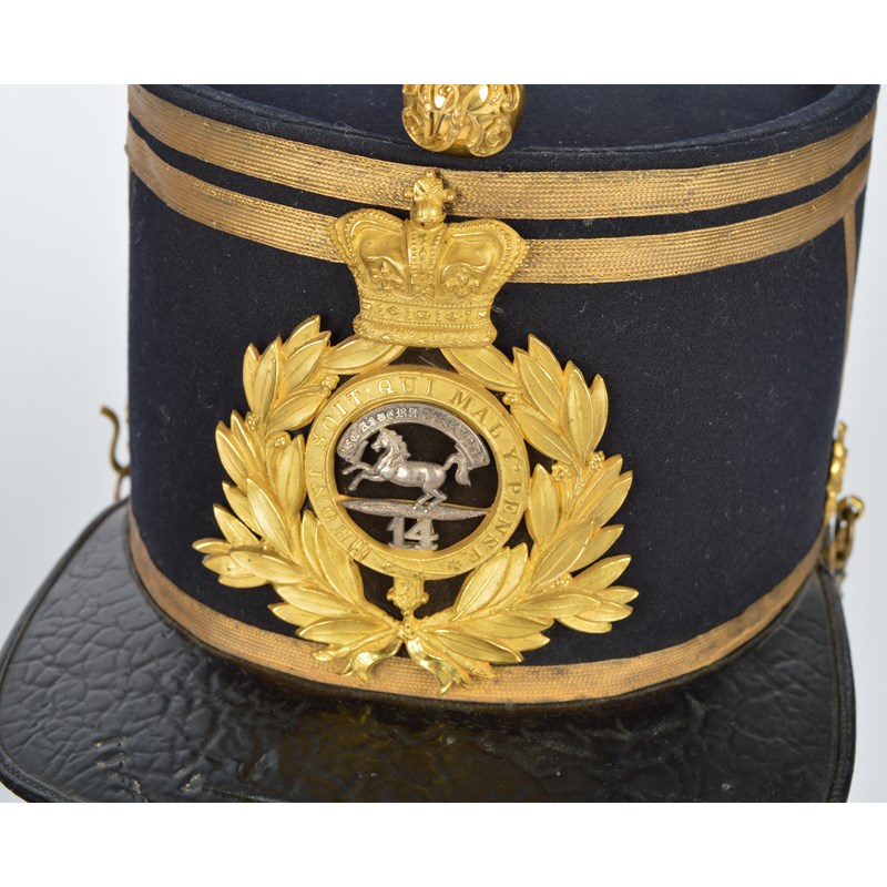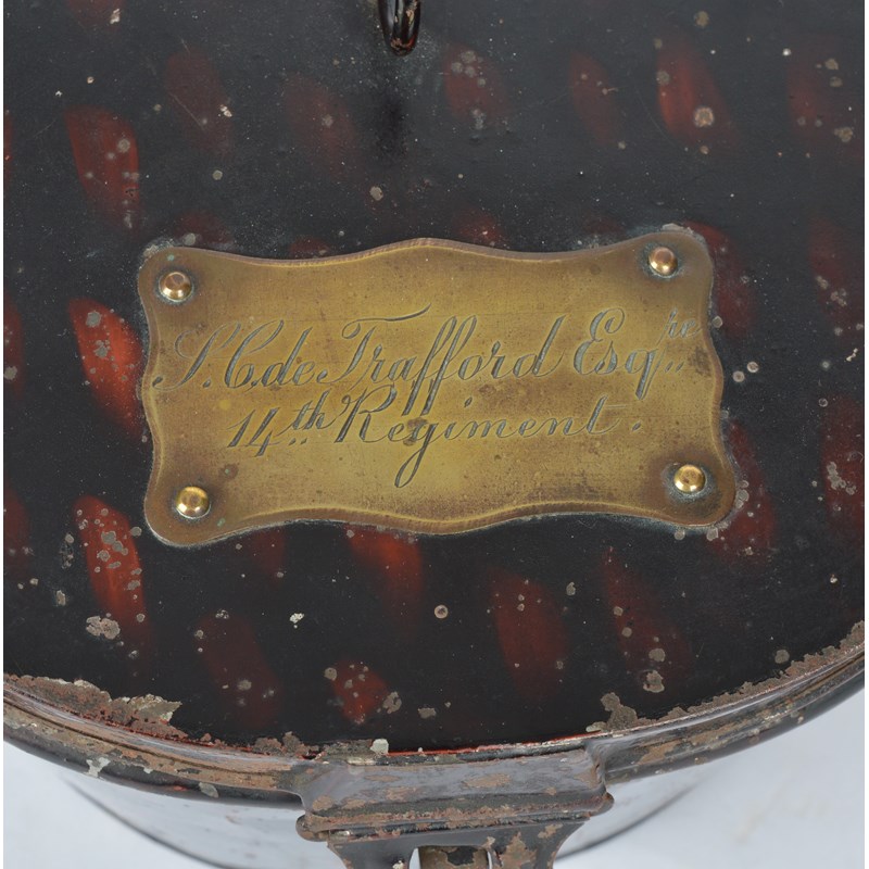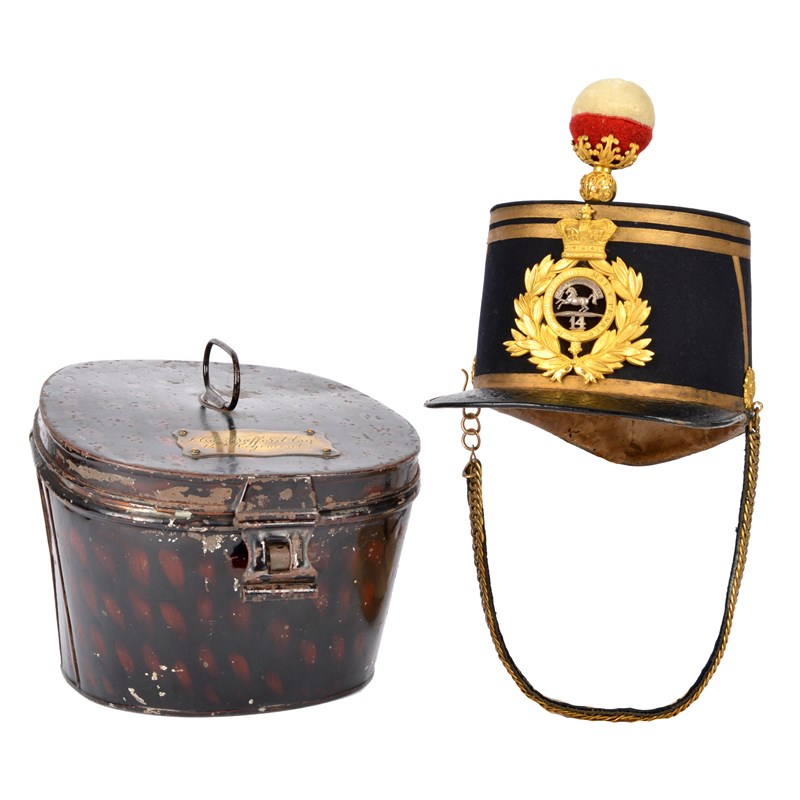 14th Regiment of Foot: an officer's shako, pattern of 1869-78, of dark blue cloth with patent leather peak, gilt plate with silver centre, gilt ball holder with VR cypher, red and white ball, quilted lining with taylor's name 'J. SKINNER & CO'; in its toleware box with brass plate to the lid engraved 'S.C.de Trafford Esq. / 14th Regiment'