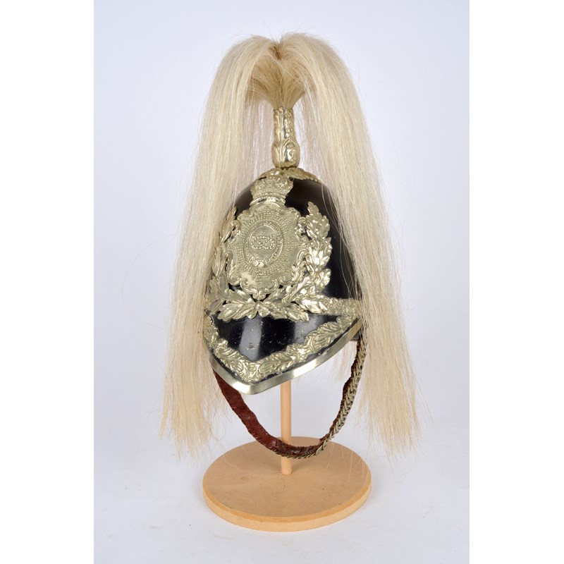 A Staffordshire Yeomanry trooper's 1847 pattern helmet, black japanned metal skull, white metal helmet plate and fittings, acanthus plume holder with white horse hair plume and rosette button, leather backed white metal chin scales, leather liner.