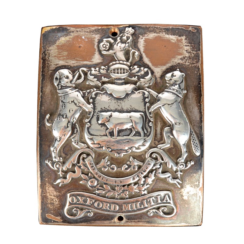 Oxford Militia: a scarce shoulder belt plate, silver plated copper, Oxford arms in relief; an ox fording water supported by an elephant and a beaver, pierced twice for mounting to a wooden base but retaining the original back fittings.
