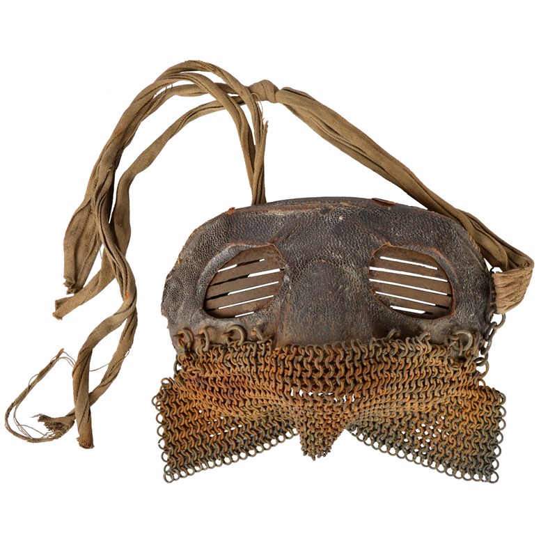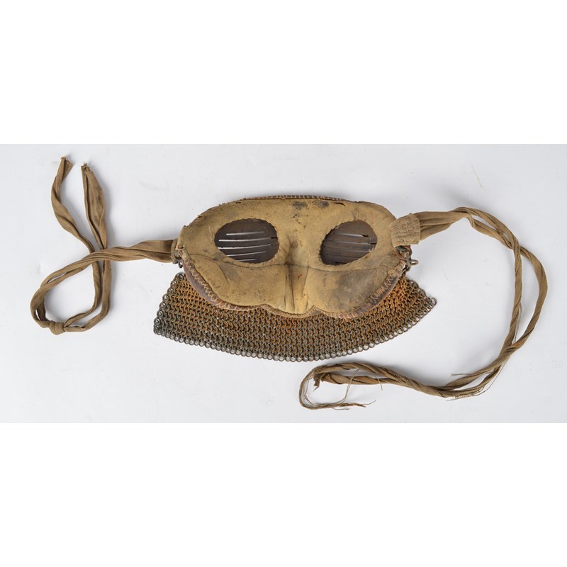 A Great War British tank crew mask, of leather faced steel with slitted viewing panels and suspending a mail skirt to protect the mouth, backed with chamois leather and secured by tapes at the side.