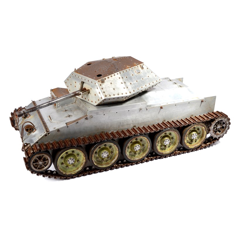A detailed scratch build model of a Crusader Tank, constructed in aluminium and steel, moving parts including the turret, main gun, road and drive wheels, track, and hatches; unfinished and offered with various additional parts, length of hull 69 cm (29 in.).
