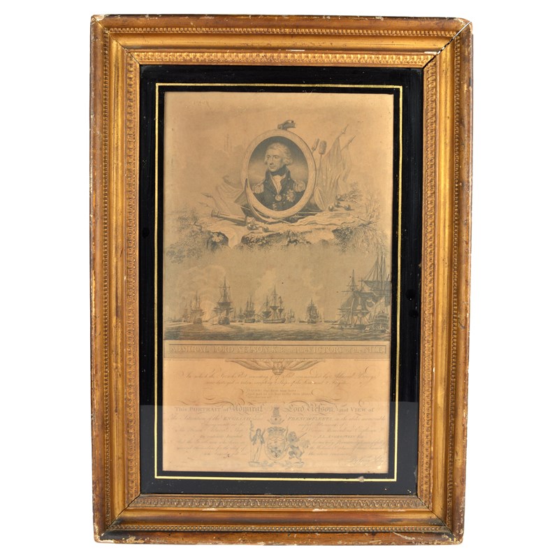 Admiral Lord Nelson: an engraving after J. F. Abbot depicting the Battle of the Nile, bust of Nelson above surrounded by cannon and chain and bar shot, descriptive panel below, marked 'Proof', in a black 'memorial' mount and gilt frame, originally sold for the benefit of widows and orphans of the battle.