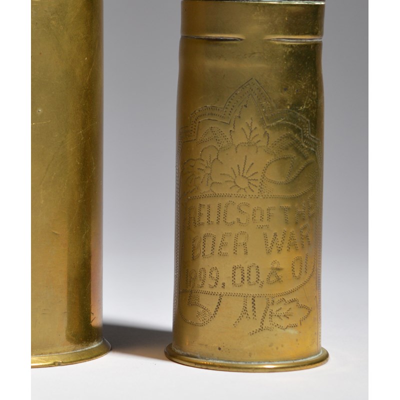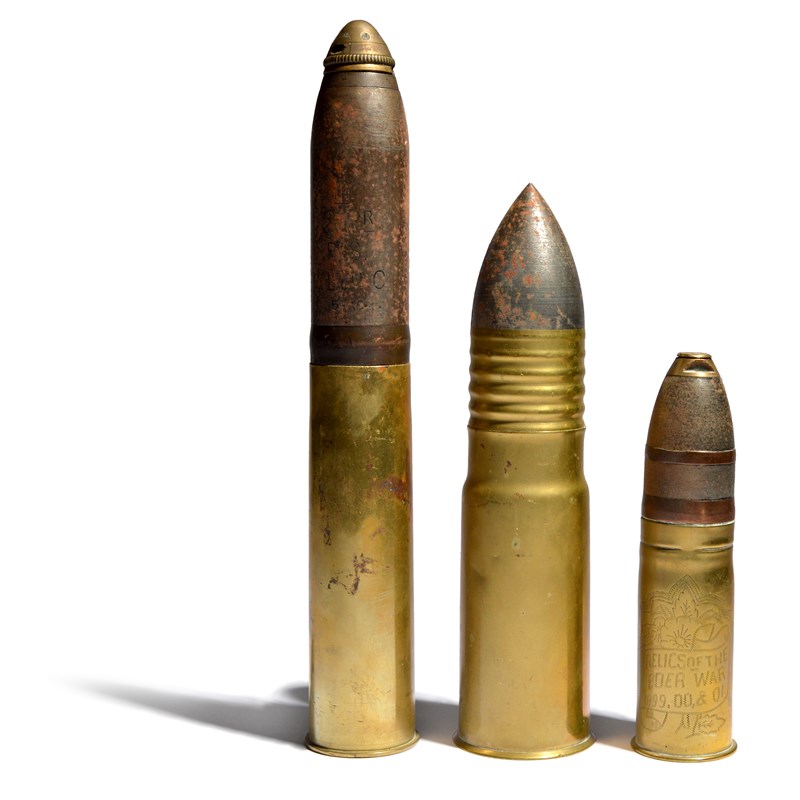 Three inert shells: a British naval 2 pounder high explosive round, by Vickers, dated 1916; a Boer War era 1 pounder 'Pom-Pom' round, with lightly impressed decoration to the case; and an early 20th Century Japanese naval shell of British manufacture. [3]