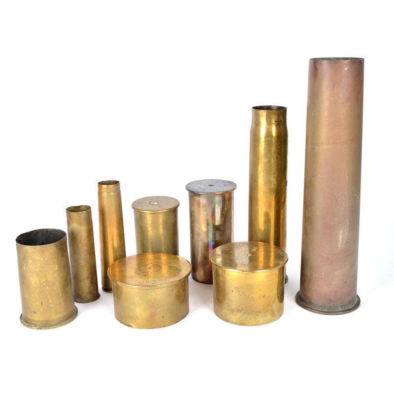 An assortment of artillery shell cases, including: British 12 pounder 12 cwt, dated 1917; 15 pdr quick firing, dated 19/11/01; 12 pounder 4 cwt, dated 1914; 4.5 inch howitzer, dated 1915; two examples with steel heads; a German case, approx. 34 mm, dated 1917; and other items. [approx 41]