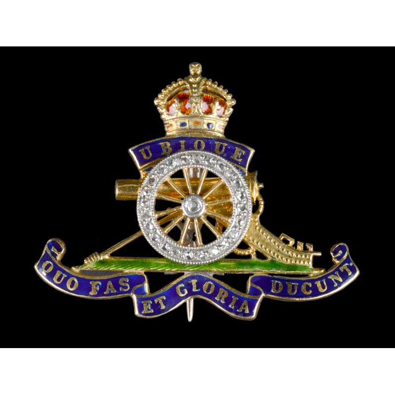 A very fine Royal Artillery sweetheart brooch, enamelled crown and scrolls, gun carriage with rotating wheel set with white stones, stamped '18'.