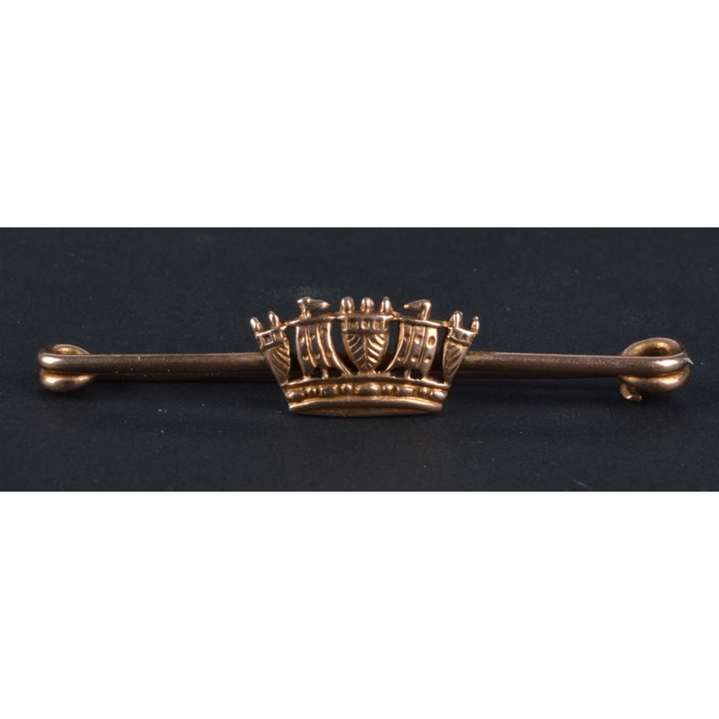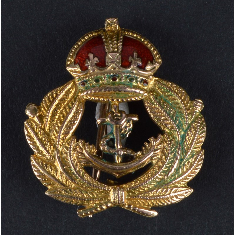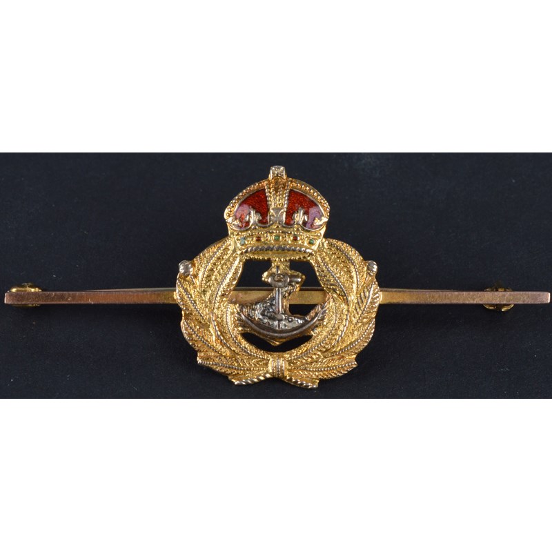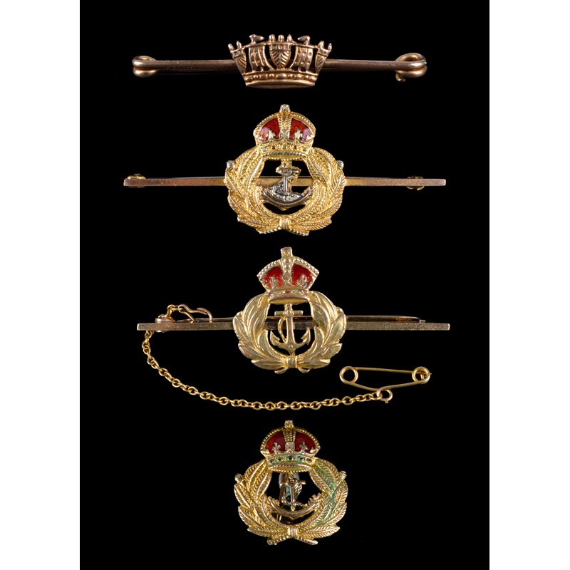 Four Naval sweetheart brooches: one with crowned fouled anchor within a wreath, enamelled and stamped '9ct' and 'P.P.Ld', engraved 'M.C. BILTON 33284 W.R.N.S.'; another of similar form, enamelled and stamped '9ct'; another similar but with vertical pin instead of bar; and a bar brooch with Naval crown stamped '9ct'. [4]