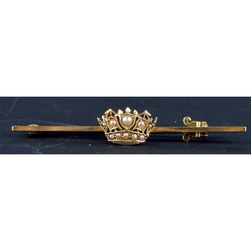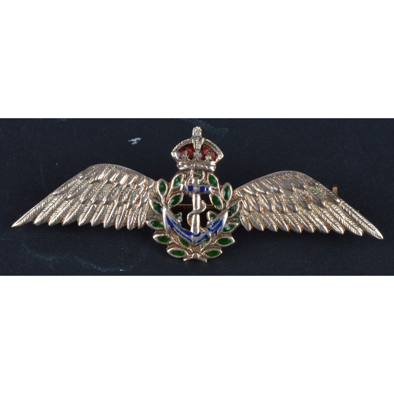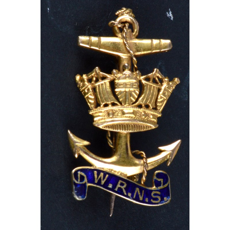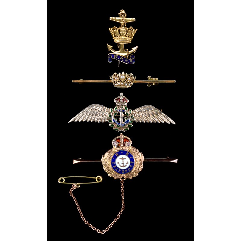 Four Naval sweetheart brooches: Royal Navy Transport, enamelled and stamped '9ct'; Womens' Royal Naval Service, fouled anchor with separately formed cable overlaid with a Naval crown, 'W.R.N.S.' to an enemelled scroll, vertical pin, yellow metal; Fleet Air Arm, stamped '9CT'; and a bar brooch with a seed pearl-set Naval crown, stamped '15CT'. [4]